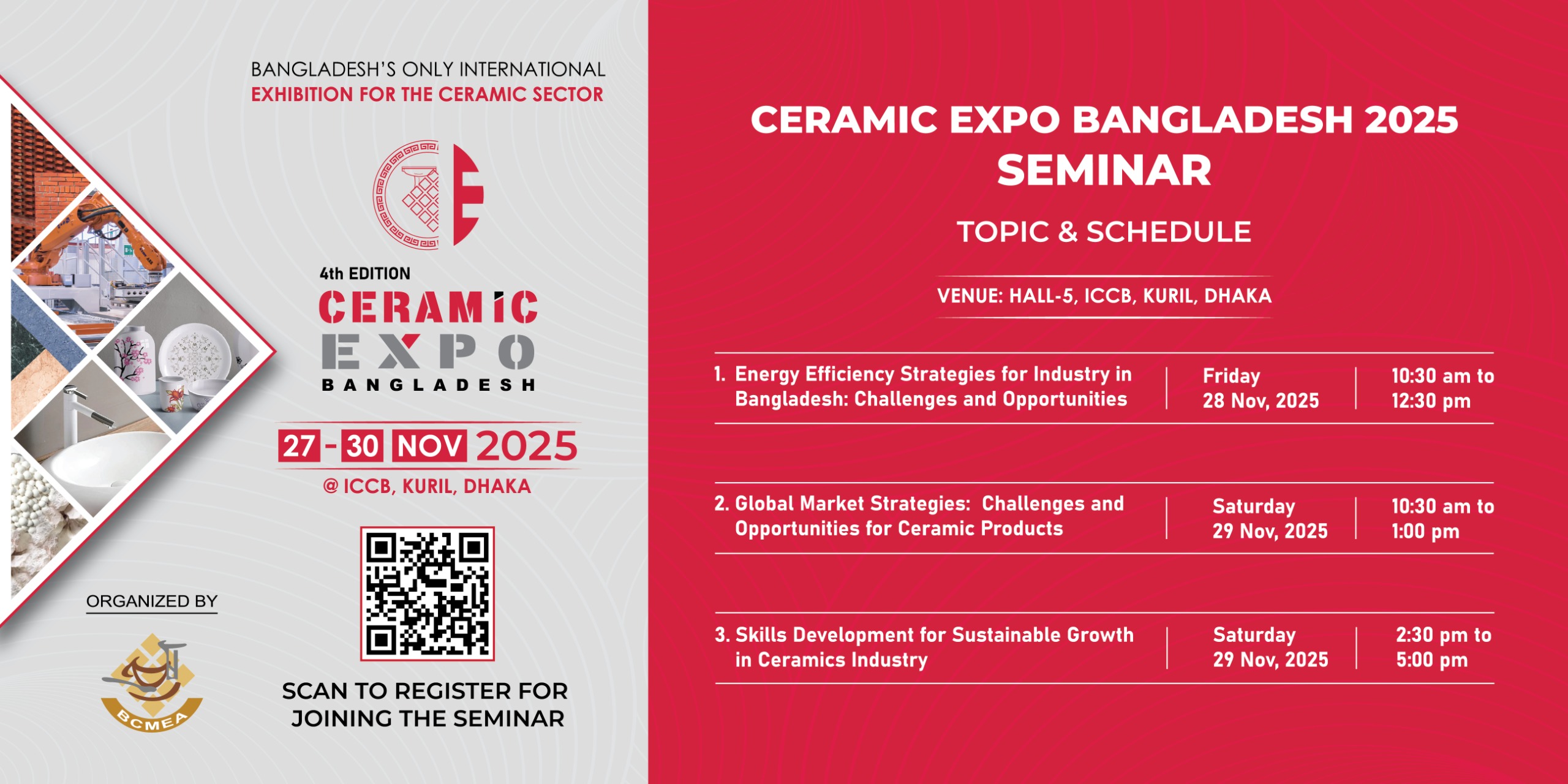 Bangladesh Ceramic Manufacturers & Exporters Association (BCMEA) is a Trade Organization approved by the Ministry of Commerce and registered by the Registrar of Joint Stock Companies and Firms of Manufacturers and Exporters of Ceramic Tableware, Pottery, Tiles, Sanitary ware, Bricks & other ceramic products in Bangladesh.
