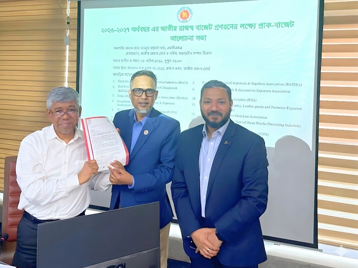 BCMEA led by Mr. Md. Mamunur Rashid FCMA, Sr. Vice President handed over the budget proposal for the FY 2026-27 to the Chairman of NBR Mr. Abdur Rahman Khan FCMA Yesterday (8 April) at NBR office.